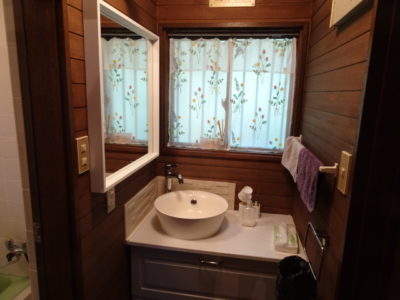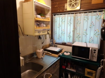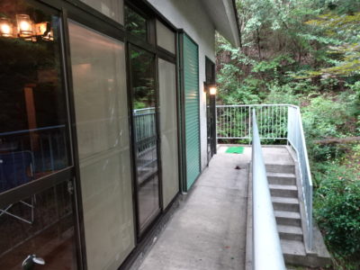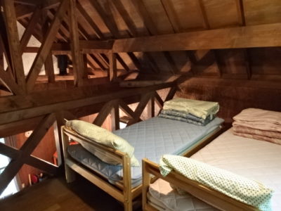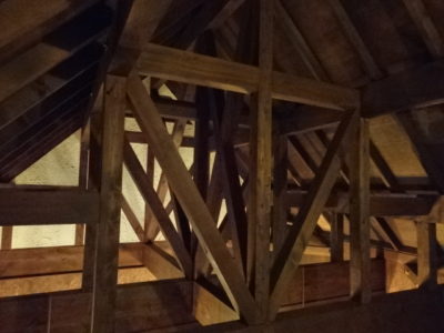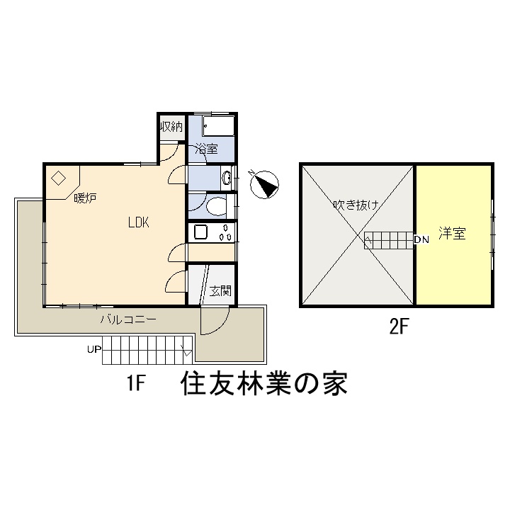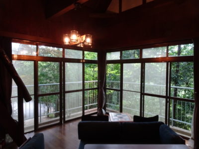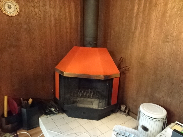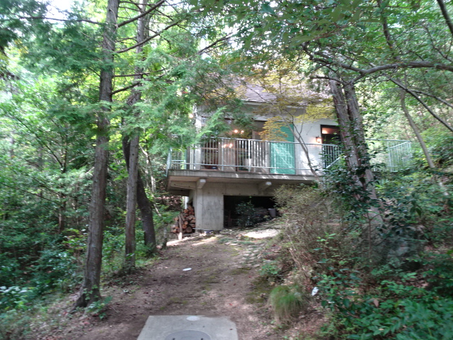 住友林業の家。木立に囲まれた静かな環境。暖炉有り。吹抜けには立派な小屋組みの梁が見えています。